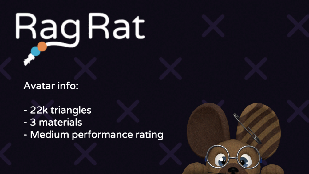 The Rag Rat is just a cute little plush rodent! You can run and hide, or pull out your miniature weapons and fight back! Featuring PhysBone interactions on the whiskers and nose, bouncy sweater physics, and a grabbable needle/bottle cap.